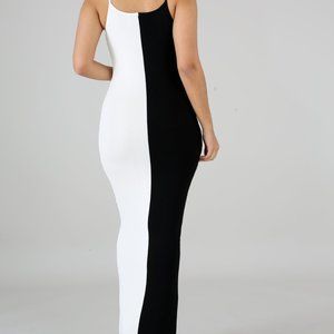 This two-tone simplicity dress features a stretchy ribbed knit fabrication, v-neckline, button accents down the front, sleeveless construction and finished with a mid/max-length, adjustable, open front high slit, finished with a front button closure.