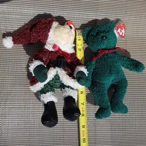 This pair of Ty Beanie Babies is perfect for collectors and fans alike. The green 2001 HOLIDAY TEDDY and red 2000 SANTABEAR are both in great shape and ready for display. The plush toys feature sparkly accents and are perfect for any Christmas occasion. Holiday Teddy has plastic protector on its hang tag.