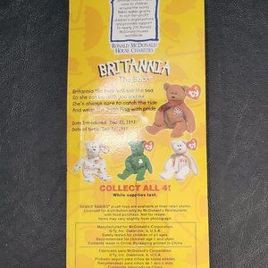 Britannia The Bear (rare) retired Teenie Beanie Baby with TAG ERRORS and DATE ERRORS. Tush tag errors-the box states that her birthday is December 15th 1997 but her tag says "1993" and she was made in Oak Brook, Illinois, but her tag reads. Oakbrook (without the space}. They are in nice vintage condition. Glory Bear has some yellowing of the plastic and wrinkle of the bottom of the plastic. See my photos for details. Non smoking pet free home.