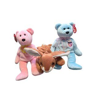 Lot of 3 Vintage Ty beanie babies plush. Pink and blue bears with easter egss on front and one brown bunny rabbit. All 3 still have the orginal tags attached. In good condition no stains or damange. Open to reasonable offers and bundle deals