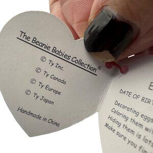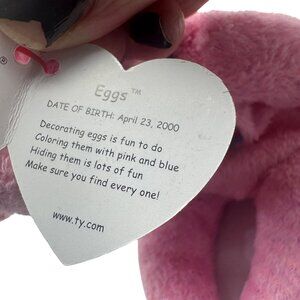 This collectible Ty Beanie Babies Eggs bear features a soft pink plush body, an embroidered colorful Easter egg, and a purple ribbon bow. It retains its heart-shaped tag displaying its name and birthdate, making it a desirable addition for collectors or fans of nostalgic plush toys.