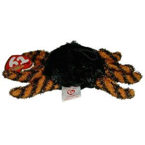 In the shadowy corners of toyland, Creeps the spider awaits, its fuzzy body adorned with black and orange striped legs. Eyes gleaming with playful mischief, it captivates all who dare approach. A collector's gem from Ty's Halloweenie Beanies, this plush arachnid is a whimsical companion, spinning tales of Halloween wonder.