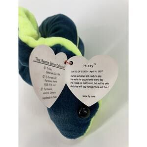 The Ty Beanie Babies Hissy Snake from 1997 is part of the Beanie Babies collection by the brand Ty. This plush toy features the character family of Beanie Babies, making it a sought-after item for collectors and fans of the franchise. With its unique design and nostalgic appeal, this Beanie Baby is a classic piece from the late 90s that is sure to bring joy to both children and adult collectors alike.