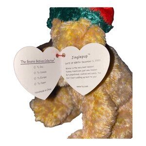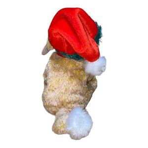 This collectible Ty Beanie Baby "Jinglepup" features a festive red Santa hat with a green trim. Its soft plush fur makes it a charming holiday addition.