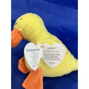 The Ty Beanie Babies Quackers Duck is a collectible plush toy from the Beanie Babies brand by Ty. This particular duck character is part of the original Beanie Babies line and has been retired, making it a sought-after item for collectors. With its adorable design and brand recognition, the Quackers Duck is a popular addition to any Beanie Babies collection.