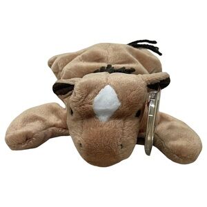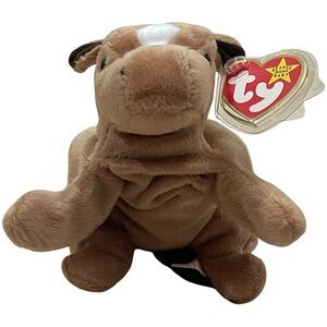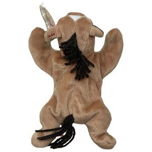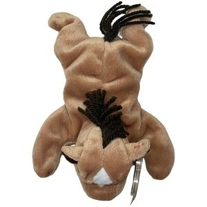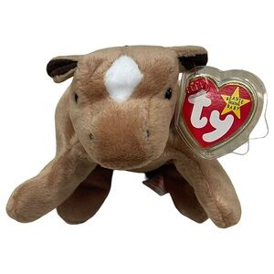 RARE RETIRED Ty Beanie Baby named Derby the Horse, a collectible plush toy first introduced in 1995. Derby has a tan body, a white star on its forehead, brown ears, and a black yarn mane and tail. There are several versions of Derby, including variations in the mane material (yarn or coarse hair), the presence or absence of the white star, and tag errors that can make certain versions more valuable to collectors. The tag visible in the image is likely the tush tag, which, along with the hang tag, can provide information about the Beanie Baby's production details and authenticity. Derby is considered a retired Beanie Baby, meaning it is no longer in production, which can also increase its value.