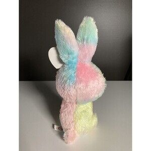 Bubby is a pastille coloured, tie-dyed rabbit with large, glittery pink button eyes and a pink button nose with an embroidered smile. She has a white belly and the inside of her ears are white with multicoloured polka dots.