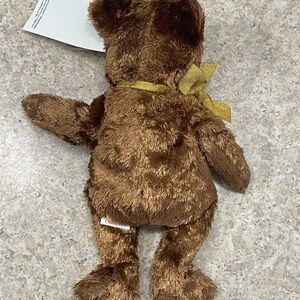This adorable brown plush teddy bear features a charming gold ribbon, perfect for cuddling and playtime. A delightful addition to any child's toy collection.