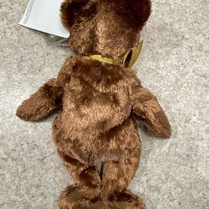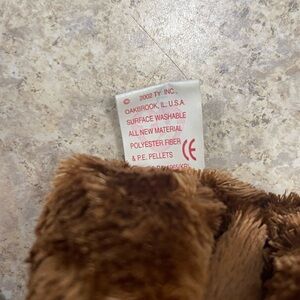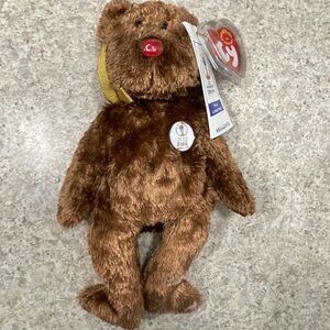 Adorable brown plush bear with red accents. Perfect for collectors or as a gift. Ty Beanie Baby "Champion" bear, specifically the version representing Turkey for the 2002 FIFA World Cup. This bear is part of a collection of 32 bears, each representing a participating nation in the 2002 FIFA World Cup. The bear is brown with black button eyes and a nose featuring the Turkish flag. It has a gold ribbon tied around its neck and a badge on its chest that says "2002 FIFA World Cup". The tag attached to the ear includes the official FIFA logo and licensing information.