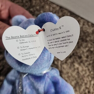 Errors: Tush tag reads 'Clubby' and ear tag reads 'Clubby II'. Mismatched tags.
