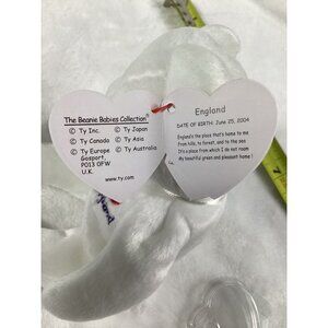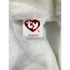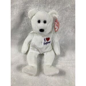 Celebrate your love for England with this adorable Beanie Baby. Featuring a sweet embroidered heart, this plush bear is a delightful collectible or gift. The soft, white plush material and detailed design make it a charming addition to any collection.
