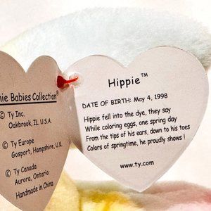 Ty Beanie Baby "Hippie" Tie dyed rabbit in pastel spring colors. Birthday is May 4, 1998. With all tags and heart protector. Vintage 1999. New condition from an estate collection. Length is approx. 9 inches.
