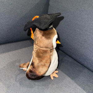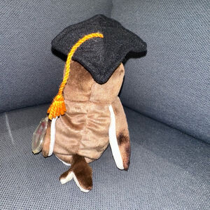 This is a new with tags Ty Beanie Baby "Beanie Owl," a plush toy in the shape of an owl wearing a graduation cap. The owl is predominantly brown and white, with a black graduation cap featuring "Class of '98." The material is polyester fiber with plastic pellets. It has a Ty heart-shaped tag attached. The owl measures approximately 6 inches in height. The condition is new with tags and shows no visible imperfections. The tags are intact and clearly display the brand, year, and care instructions. The item is in its original packaging.