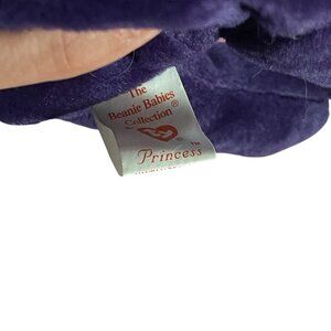 Original 1997 Ty “Princess” Beanie Baby in royal purple with embroidered white rose and satin ribbon bow. P.E. pellets; made in China (tush tag shown). Measures ~8.5–9". Clean and plush; normal light handling. Swing/hang tag not present (tush tag intact). Iconic memorial bear for collectors or décor.