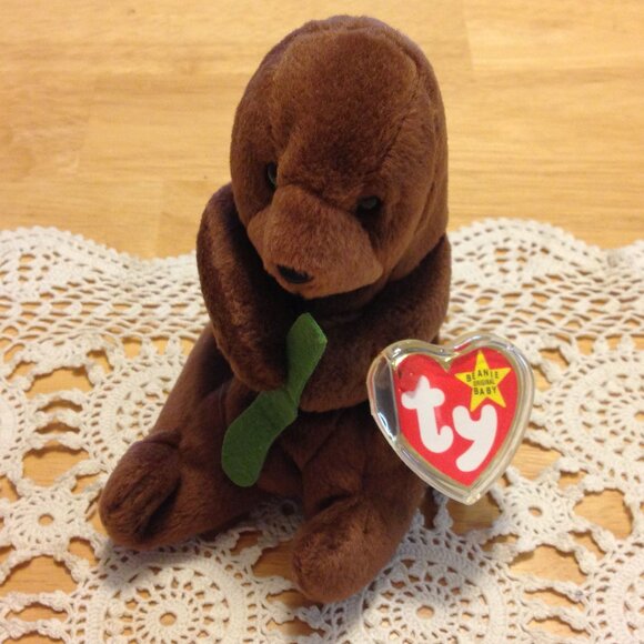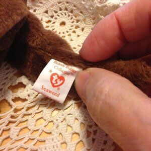 Ty Beanie Baby Seaweed the Otter. Born 3-19-95, considered vintage for the brand. Good, clean, used condition with light wear on top edge of hang tag. Someone probably put in plastic heart in careless fashion, see close up. Collectible beanie baby plush. Handmade in China. Rare P.V.C. Pellets.