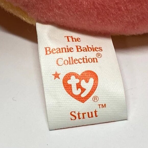 This is a TY Beanie Baby named STRUT the Rooster, part of the original Beanie Babies collection from 1996. It is a rare and retired collectible plush toy suitable for children aged 3 and up.