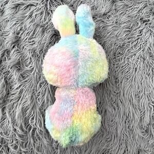 Bubby is a pastille coloured, tie-dyed rabbit with large, glittery pink button eyes and a pink button nose with an embroidered smile. She has a white belly and the inside of her ears are white with multicoloured polka dots. Her fur is made from super soft Tysilk.