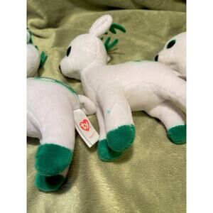 Pre-owned, Ty Beanie Boos Collection Set of (3) Peppermint Christmas Reindeer (2017). Cute reindeer features a green/white colors, green iridescent antlers, green sparkle eyes, & soft plush bodies. Ty tush tags in place. Measure 8" tall, 5 1/2" across, & 2 1/4" wide. All are in great condition- no holes, rips, stains or fraying. One has a small green area on lower front leg-defect present when made. Comes from a smoke free, pet free home.