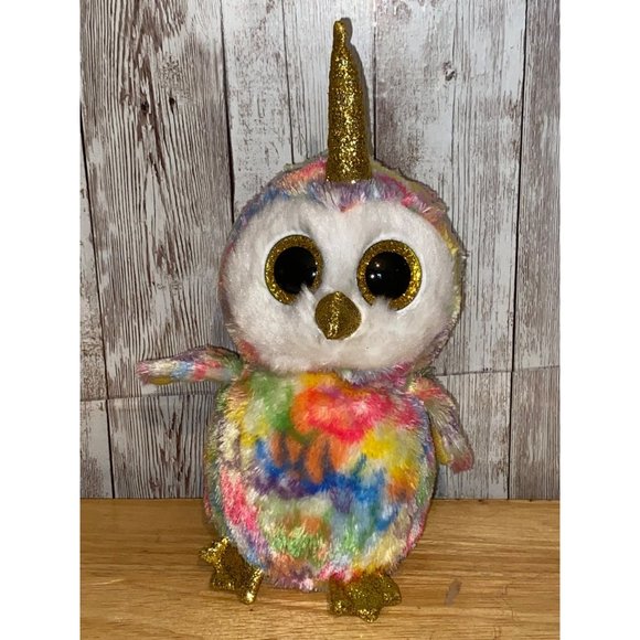 Ty Beanie Boos Silk Enchanted Unicorn Rainbow Owl Gold Horn Plush Stuffed Animal