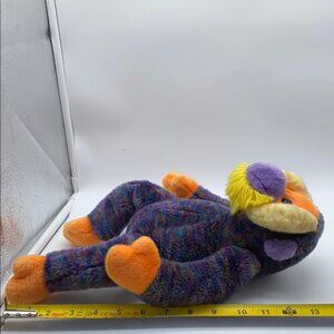 Adorable plush monkey toy with vibrant colors. Perfect for kids to cuddle and play with. Features a mix of orange, purple, and yellow hues. Note: small stain on 1 hand. See last picture.