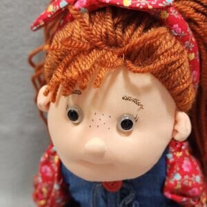 Fine Toy Doll, red hair, floral shirt, blue jean skirt. Embroidered face?