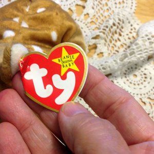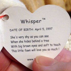 Collectible Ty Beanie, 1997 vintage Whisper the deer fawn. In excellent, clean, used condition. Error: space between much and ! i poem on hang tag. P.E. Pellets. Stamp on inside of tush tag #416.Tush tag says handmade but stamp inside that tag usually means mass produced. May be error. Tush tag says 1998 but Date of birth on hang tag is April 5, 1997. May be error. Great birthday gift or stocking stuffer for the Ty Beanie collector!