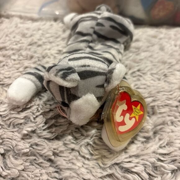 Charming plush cat with gray and white stripes. Soft and perfect for cuddles. Classic Ty design.