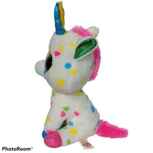 Ty Harmonie Unicorn VelveTy Beanie Boo plush toy. Features glitter eyes, horn, and confetti details. Measures 8 inches.