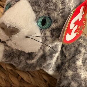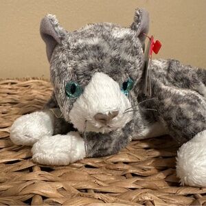 This charming Ty cat plush toy features a delightful blend of gray and white colors, capturing the essence of a real feline. Its soft and cuddly texture makes it a perfect companion for cat enthusiasts and collectors alike. With its lifelike design, this toy is sure to bring joy and comfort to anyone who loves cats.