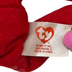 Adorable red teddy bear with a flag ribbon around its neck. Perfect for collectors or as a gift. "Teenie Beanies" are miniature versions of Beanie Babies distributed as McDonald's Happy Meal toys. The Beanie Baby in the image is not a "Teenie Beanie" due to its size and the tag design. "Teenie Beanies" have a different tag and are much smaller in size compared to the original Beanie Babies.