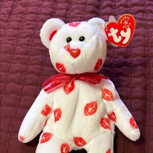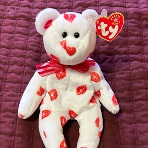 Adorable Ty bear with red lips pattern. Features a red bow. Perfect for gifting.