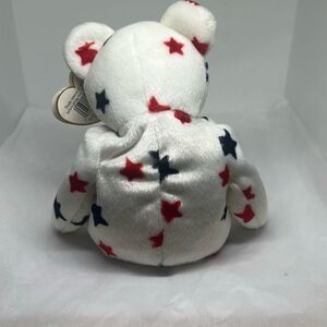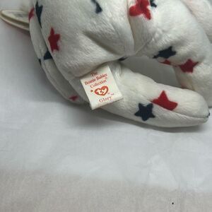 Celebrate your love for the USA with this adorable Ty Beanie Baby "Glory" bear! This collectible plush features a soft white body adorned with red and blue stars and an embroidered American flag on the chest. It's perfect for collectors or as a patriotic gift.