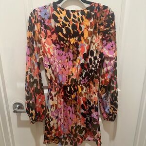Vibrant multicolor dress with long sleeves. Perfect for a bold statement.