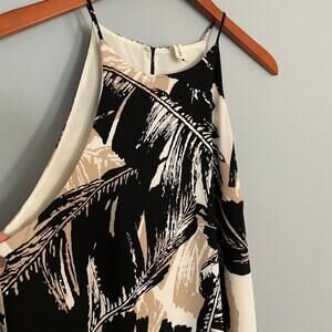 Cute neutral dress in a flowy style with an abstract artsy leaf print in cream, tan and black.