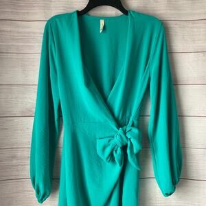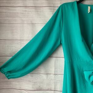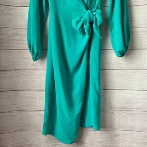 Turquoise or teal green midi wrap dress by Tyche. It has long, billowy balloon or bishop sleeves, a hidden modesty tie, visible thick tie strings that can tie in a bow, a V neckline, and a V at the bottom front that's formed by the wrap front. It is pre-owned, with one very faint spot on the back of the neckline, but is otherwise in great condition.