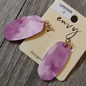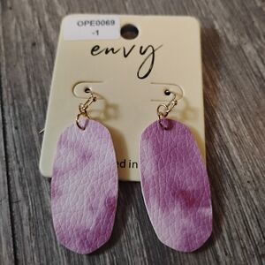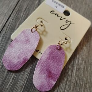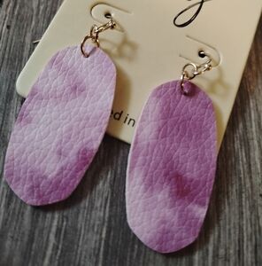these are tye dye leatherette earrings that are purple and white looking like smoke with gold hardware. they are hexagon shaped and are weightless!