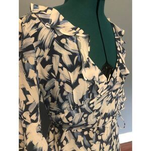 This gorgeous 100% silk dress is lightweight and high quality! It is in great pre-loved condition. It has gorgeous ruffle details around the neckline, sleeves, and bottom hem. It has a helpful left side seam zipper closure.