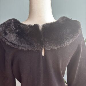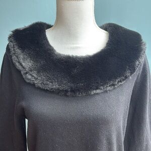Black with faux fur detail around neckline and cuffs.