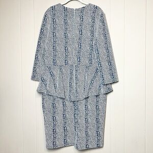 Tyler Boe Long Sleeve Peplum Sheath Dress large blue reptile V neck stretch knit modest mature career office wear to work