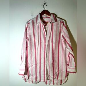 Stylish pink and white striped button-up shirt. Perfect for casual or formal occasions.