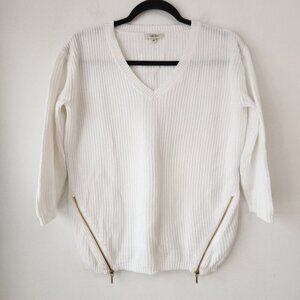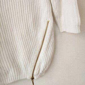 This Tyler Boe sweater is absolutely beautiful. It features a ribbed knit, is incredibly soft, cozy, has zipper details on the front, and drop shoulders. Perfect for Fall, Winter, or Spring.