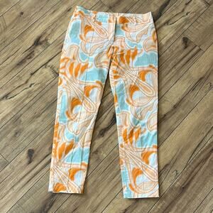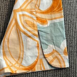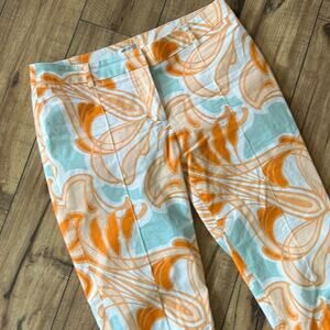 Tyler Boensize 4 womens cropped pants in great condition. Orange, aqua and white. Waist measures 15” across. Inseam is 25” and rise is 9”. Close up picture of the slits in the back of the pant leg. Super cute!