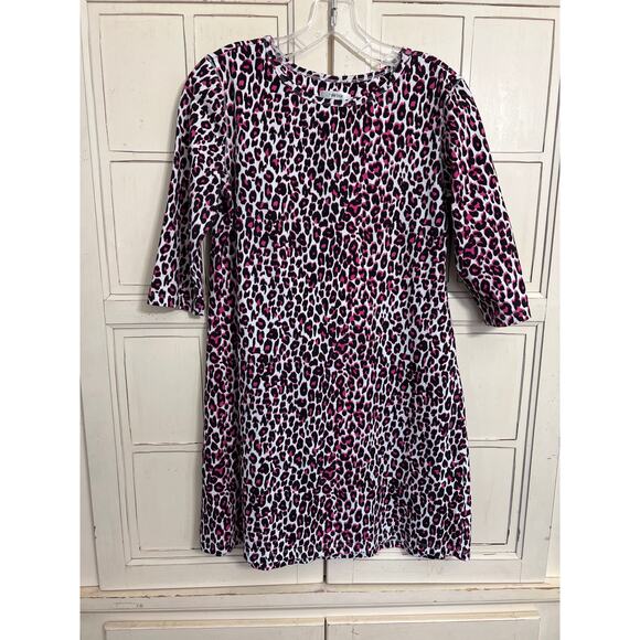Tyler Boe size medium animal print stretchy knit tunic top or dress in excellent condition. White with black and bright pink. 3/4 length sleeves. Measures 18” from armpit to armpit. 18” across the waist and it is 32” long.