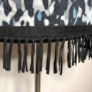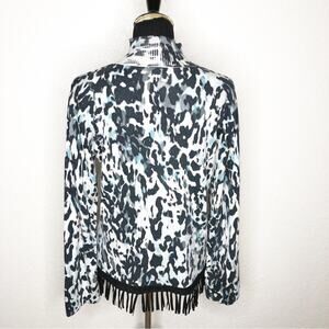 Tyler Boe white black blue fringe trim animal print sweater. Pullover style with mock turtleneck neckline. Faux suede fringe trim hemline. Size Medium. Cotton cashmere blend. Excellent preowned condition. Minor wash wear.