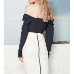 This is a beautiful skirt by Tyler Madison. This is a bit waxed and a stretch material. Fits fabulously with the zipper detail down the back.