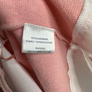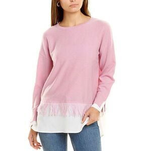 100% cashmere pink sweater with fringe detail and white layered detail.
