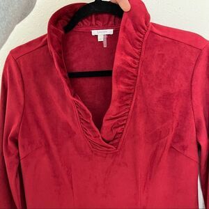 DESCRIPTION: Soft Faux Velvet, Ruffle Collar, Sheath Fit, V-Neck, Long Sleeve, Stretch