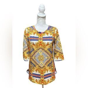 • Scarf Print Tunic T-Shirt In White Multicolor With Elbow-Length Sleeves And Slits At Hem
