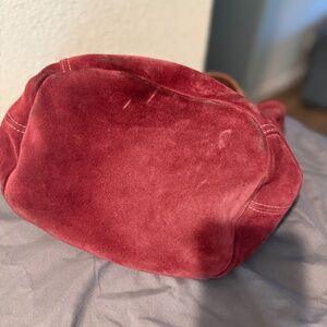 This bag is extremely hard to photograph. Suede usually is. The color is darker in person. It is like a cabernet color. This is in very good condition for its age showing some minimal signs of use which is just some darkening along the edges and bottom of the bag, This can be cleaned to look like new. I used a flash in most of the photos to capture everything but a flash on suede usually makes its look worse than it is. That is definitely true in this particular instance. As there is some dirt on the edges and bottom but boy it looks so much worse in the pics than in real life.