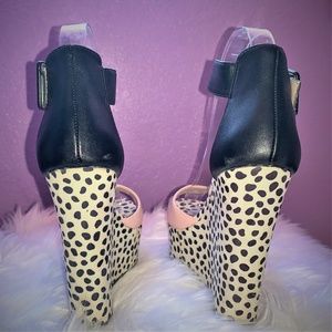 Tylie is a such a cutie. Black ankle strap and heel, polka dot platform and bubble gum pink upper. Very gently used, heel measures 5 1/2" but wears comfortably due to platform.
